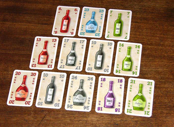 The cards consist of seven colored suits, represented by different types of wine. Each type of wine comes in three vintages, the oldest vintage earning three stars while the youngest is given a single star. Each card appears three times, making 63 cards in all. Three empty bottle cards are also present, making a total of 66 cards in the deck. Players score points for each star present on a card when it is placed in their cellar, but important bonus points are earned for lining up three cards of a similar suit (horizontal or diagonal, or in a 3 card pyramid) that either contain all the same vintage (same number of stars) or have one of each type of vintage (one star, two stars, and three stars). Players grow their pyramid of wine cards as the game progresses, adding cards to an upper portion only if it is supported by bottles underneath. Since cards cannot be adjusted once placed, care and planning have to be used to gain as many bonus points as possible. However, the empty wine bottles break this rule as players may use them to build their cellar and then replace them with a full, colored bottle of their choice at a later time.