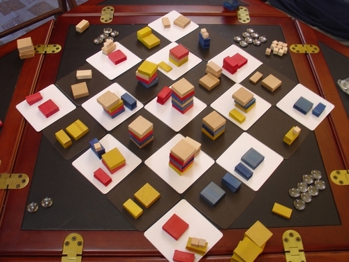 Square on Sale, which won the Hippodice Game Designer award in 2005, is a simultaneous auction game with elements of Othello, as well as block-stacking games like Focus or Manhattan. That’s quite a mouthful, but the combination works and makes for an interesting and challenging game. As the title implies, there are 25 squares in a 5×5 checkerboard available for sale. You can bid on a square by placing some of your chips there; if an opponent’s bid is there, you have to exceed their bid. If your bid hasn’t been topped in two turns, you win the square. That means you get to place a block of your color on the square; if there are other blocks already there, you place your block on top of the stack. Your chips stay there to make it harder for opponents to steal the square from you.