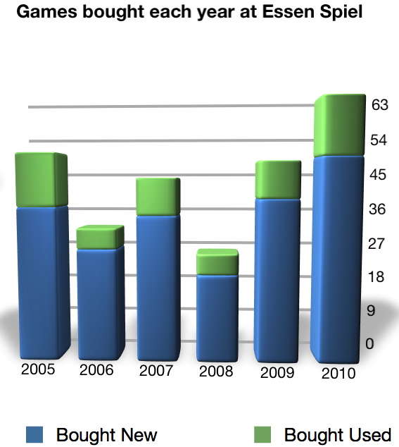 From 2005-2010, I attended every Essen Spiel (six of them) and purchased a total of 263 unique games. I have also purchased a number of games I don’t include on this list, like backup copies of card games (I have enough Wizards and Tichu’s to last me 10 years at least). Those games include both new (208) and used (55) games (the used game market is rich with bargains and hard-to-find-in-the-US titles). I categorized the “new” games as in shrink, new to me, and published within the same or previous calendar year (sometimes I just don’t hear about games until I’m Essen, even if they’ve been out for a while). I’ve averaged really close to 80% new game purchased vs. used each year, with very little fluctuation (the least was 74%, my first year there, and the most was 84%, my second year there).