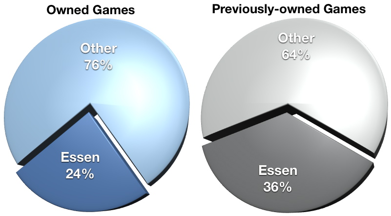 So for all those games I’ve purchased, how many do I still own? Well, that’s unfortunately a somewhat sad story. I still own only 155 of those 263 game purchases. In fact, if you look at my overall collection of games, Essen purchases represent just 24% of my 640+ game library. Comparing Previously-owned games makes it even clearer that Essen purchases are more likely to be sold than ones I purchase at other times during the year. And that doesn’t include the wacky buying spree that I had (like so many other gamers) right when I got into the hobby…how many new-to-the-hobby people have gone through the top 10/50/100 and started ordering willy-nilly from Boards & Bits or another online reseller? Take away the initial “oh-my-god-i-had-no-idea-these-games-existed-and-i-want-them-all-right-now” first year purchases, and I’m certain that Essen games would be more than half of my previously-owned games.