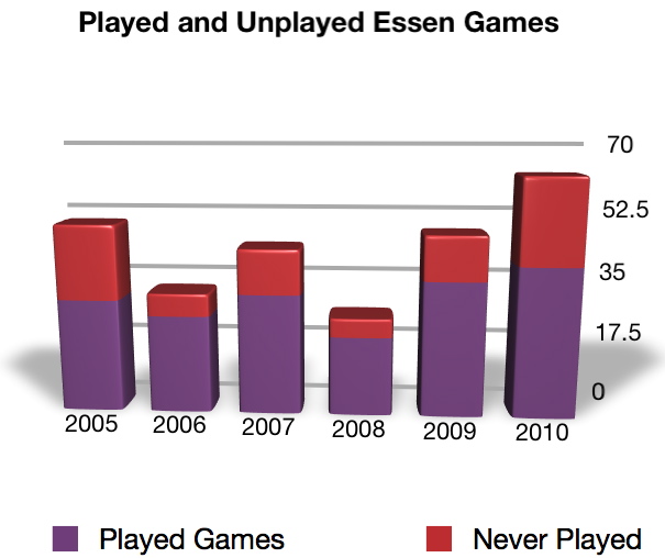 Used games that I’ve purchased at Essen have fared better than new games, probably not surprisingly. I’ve gotten better in subsequent years with used games, purchasing games almost always that I’ve at least heard of before, and usually even played. It looks like I’m doing better with keeping what I bought over time, especially in 2010, but part of that number is due to the larger number of games and just never playing a bunch of them (more on that shortly).