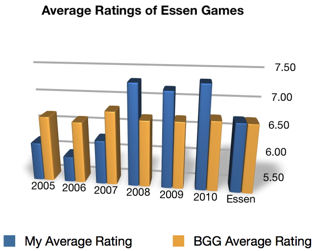 Finally, let’s look at the ratings for Essen games I’ve purchased. Overall, it’s of course hard to glean much from the BGG ratings, since the numbers are so tight, but it’s interesting to note that the BGG average is really consistent relative to my average, which has increased, particularly in the last three years. Am I being more discriminate? Or am I merely a victim of the “liking new games more than the old ones” syndrome (oddly enough many gamers are victims of the opposite).