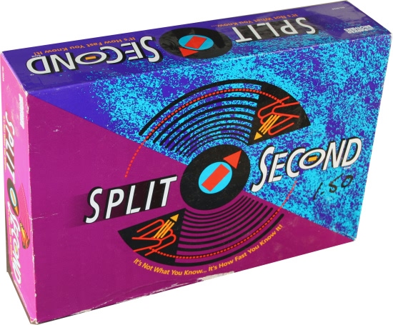 The main mechanism in split second is a central core that has places for six arms to be attached around it. These arms are rubber band powered to quickly snap shut toward the device’s center. So the way the game works is one player reads off a question whose answer is either a number or a couple letters. Then players quickly write their answer in crayon on a flat surface at the end of the arm. By letting go of the arm and having it race to the middle, a stack is formed with the earlier answers at the bottom. The correct answer is then read off and paddles are pealed back to reveal what was scribbled on them. Whoever gets the answer closest to the correct one wins the point. In any tied or equally off situations, which happens very frequently, the person whose paddle is lowest wins. What makes the game work so well is that it is a mixture of very common knowledge that has to be pulled quickly (“A car: _ _ Beetle”) and interesting statistical guessing (“How many minutes a day does the average person spend outside?”). And just to keep things really interesting, there are some questions whose answers are given by the asker (“How many times have I gone skinny dipping?”). This is a game that is hard to excel at, but very easy to enjoy.