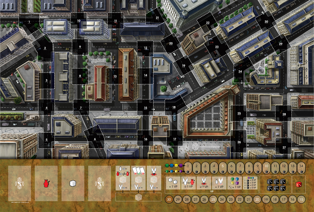Mesaboardgames is still relatively new to the boardgaming scene – they first popped up on the radar at Essen 2010 with Caravelas, a beautifully produced game about Portuguese exploration in the colonial area. Last year, Vintage took gamers through the production and delivery of Port wine. (Yes, they’ve had other games than these two – but these are the two I’m most familiar with…) As you can guess from their previous games’ subject matters, they are a Portuguese company. Their newest release breaks from that trend and is set in a generic metropolitan city map. The company was nice enough to send out an advance copy of the game, and I’ve had the chance to get it to the table once with my boys. The full release of the game should be in a few weeks at GenCon 2012.
