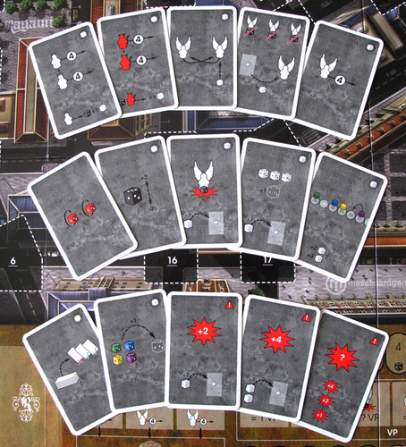 The game is played on a downtown city map. There are plenty of city blocks which are surrounded by streets that have specific spaces for game pieces. At the start of the game, 6 Conflict Dice are randomly placed on the board – they are rolled and placed on spaces which are drawn randomly from amongst the Location chips. Four Demons are also randomly placed on the map by selecting Location chips. Players then take turns to place their angels, Ragami and virtue dice (all in their own color) on the board as well.