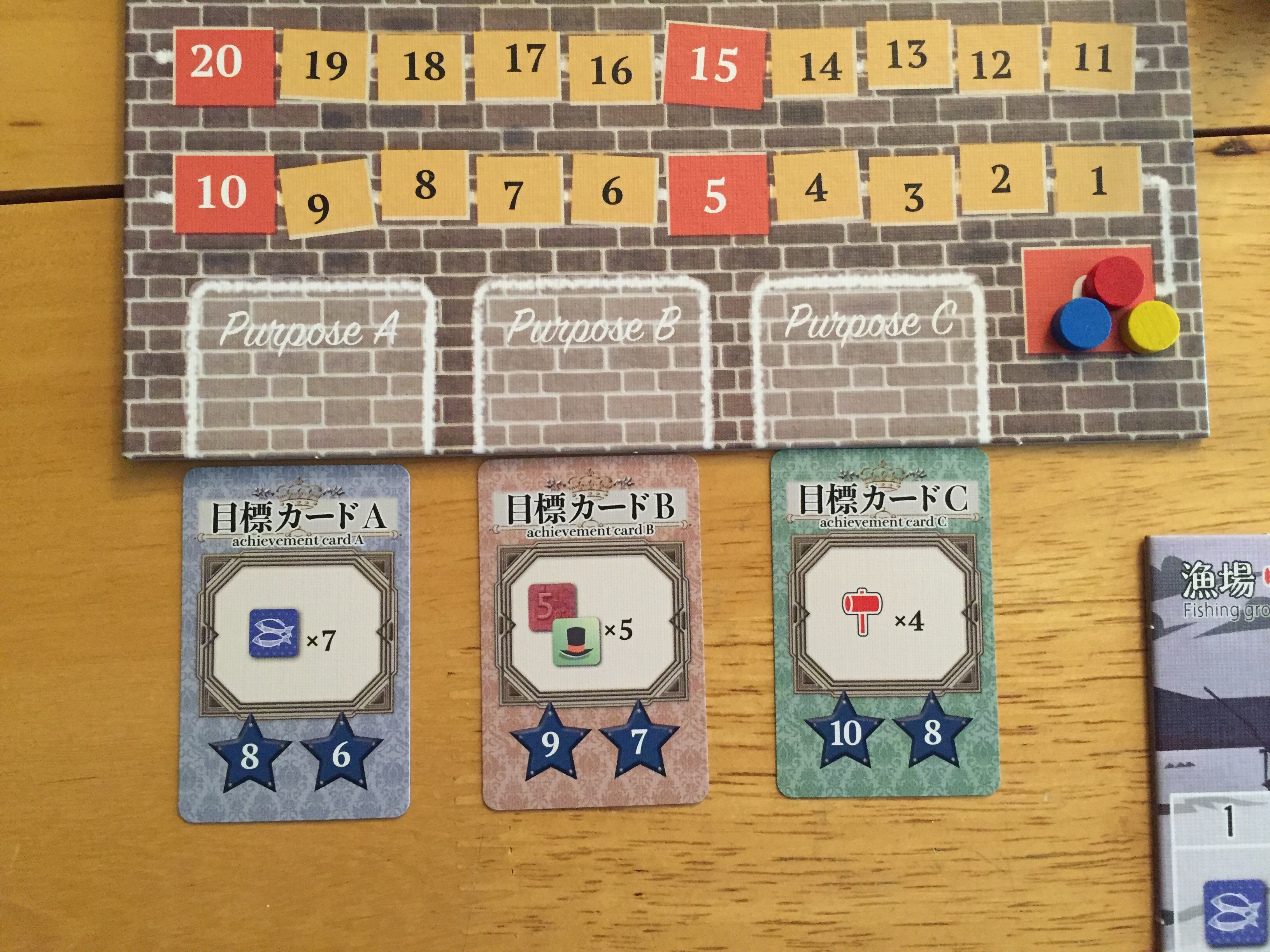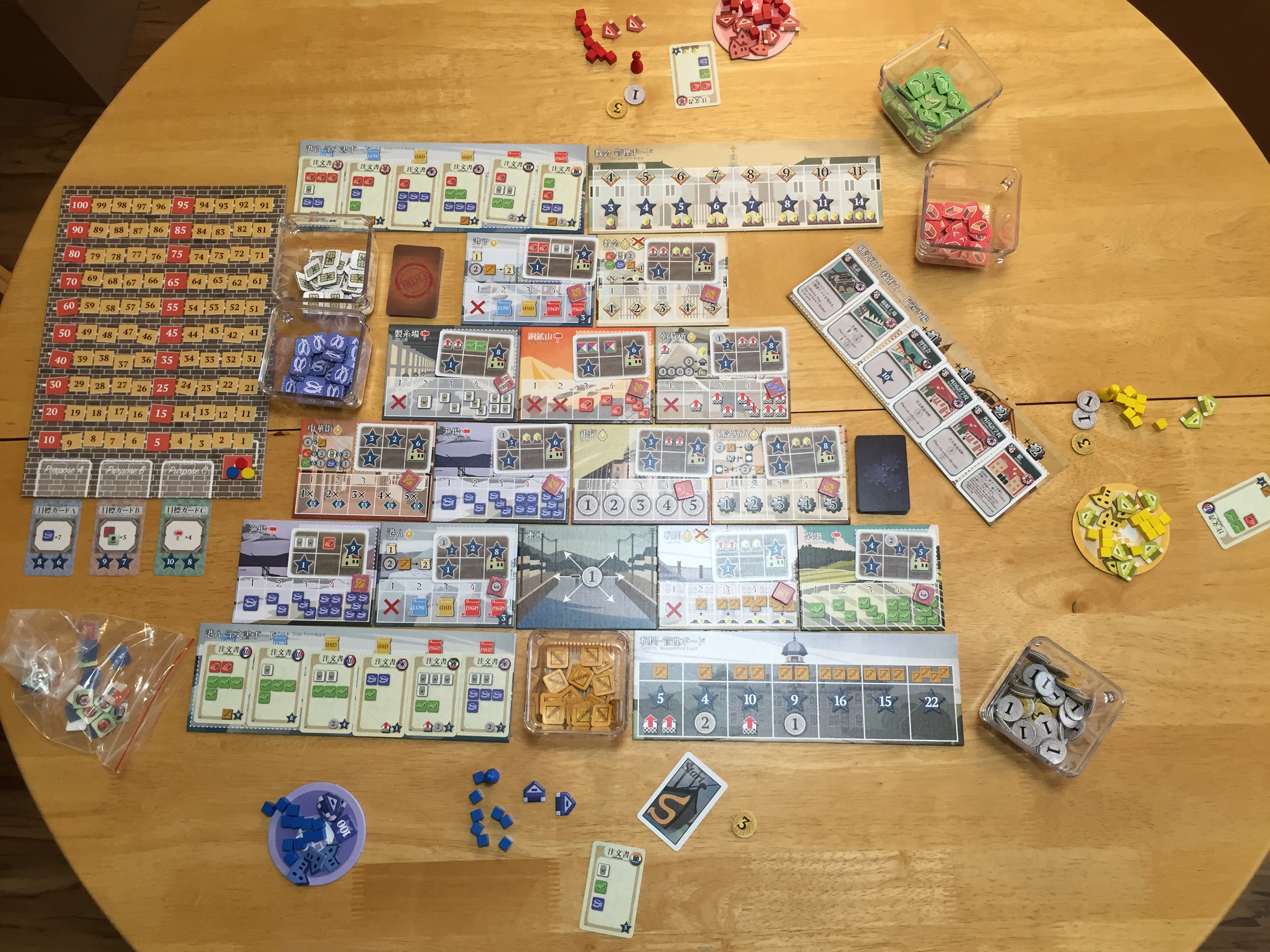 The game consists of a modular board. The size of the play area adjusts to the number of players. The board tiles are nicely done with thick cardboard and functional art. The games also comes with quality cards and ubiquitous cubes. The cards contain both Japanese and English so the print is on the small side. The game box has great graphics and is just the right size to fit everything.