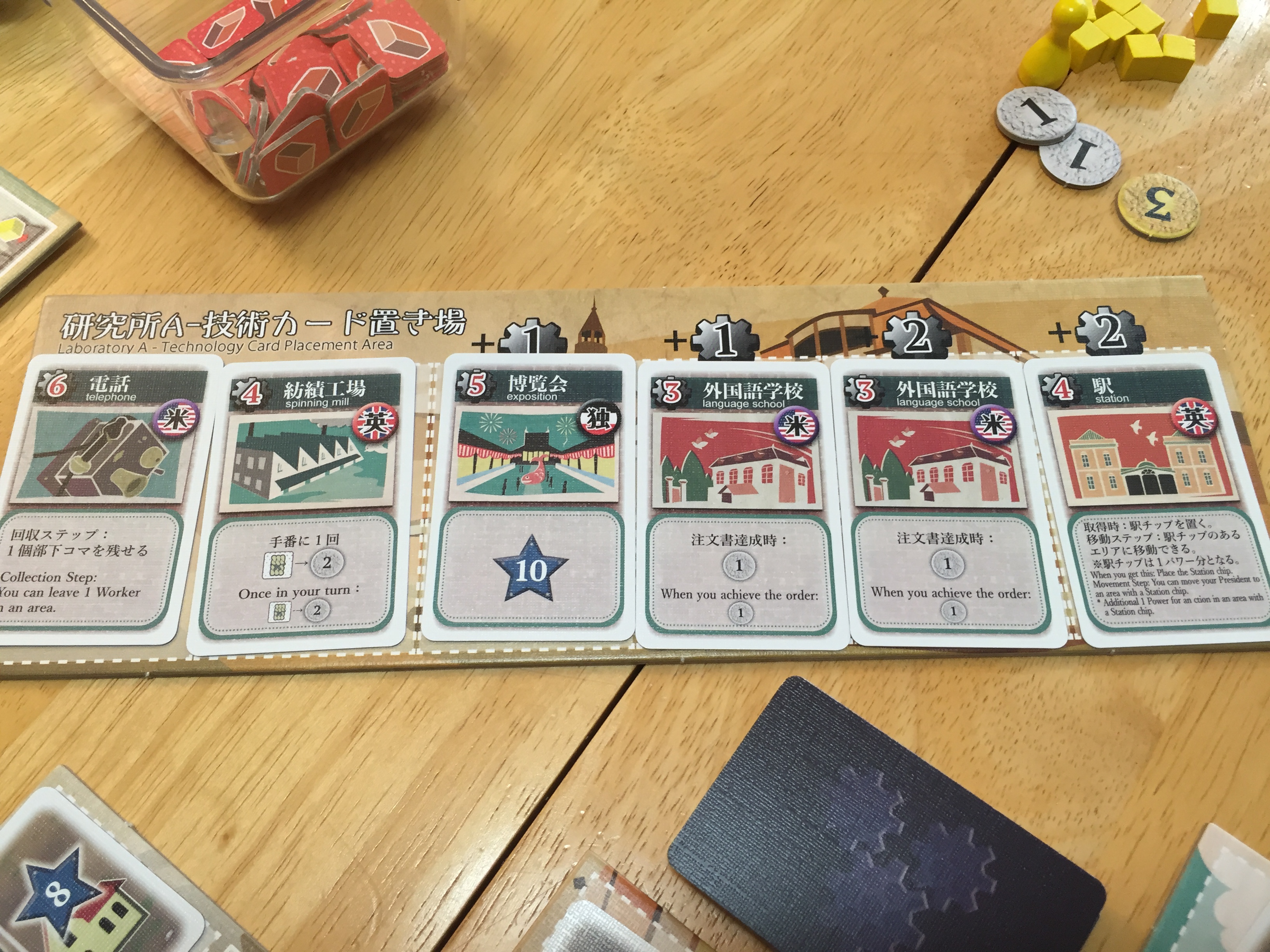 My only issue with the game is the tiny print used for the English on the technology cards; while the original edition is certainly playable, I would advise English speakers without excellent eyesight to get the now-Kickstartering TMG edition which will have more room for English since they are not including the Japanese. And if you like lots of wooden bits, TMG will sell you a deluxe version, but I think the cardboard in the regular version is perfectly fine (as opposed to the components in Hiyashi and Ozaku’s earlier Minerva, which were a bit too small and thin).