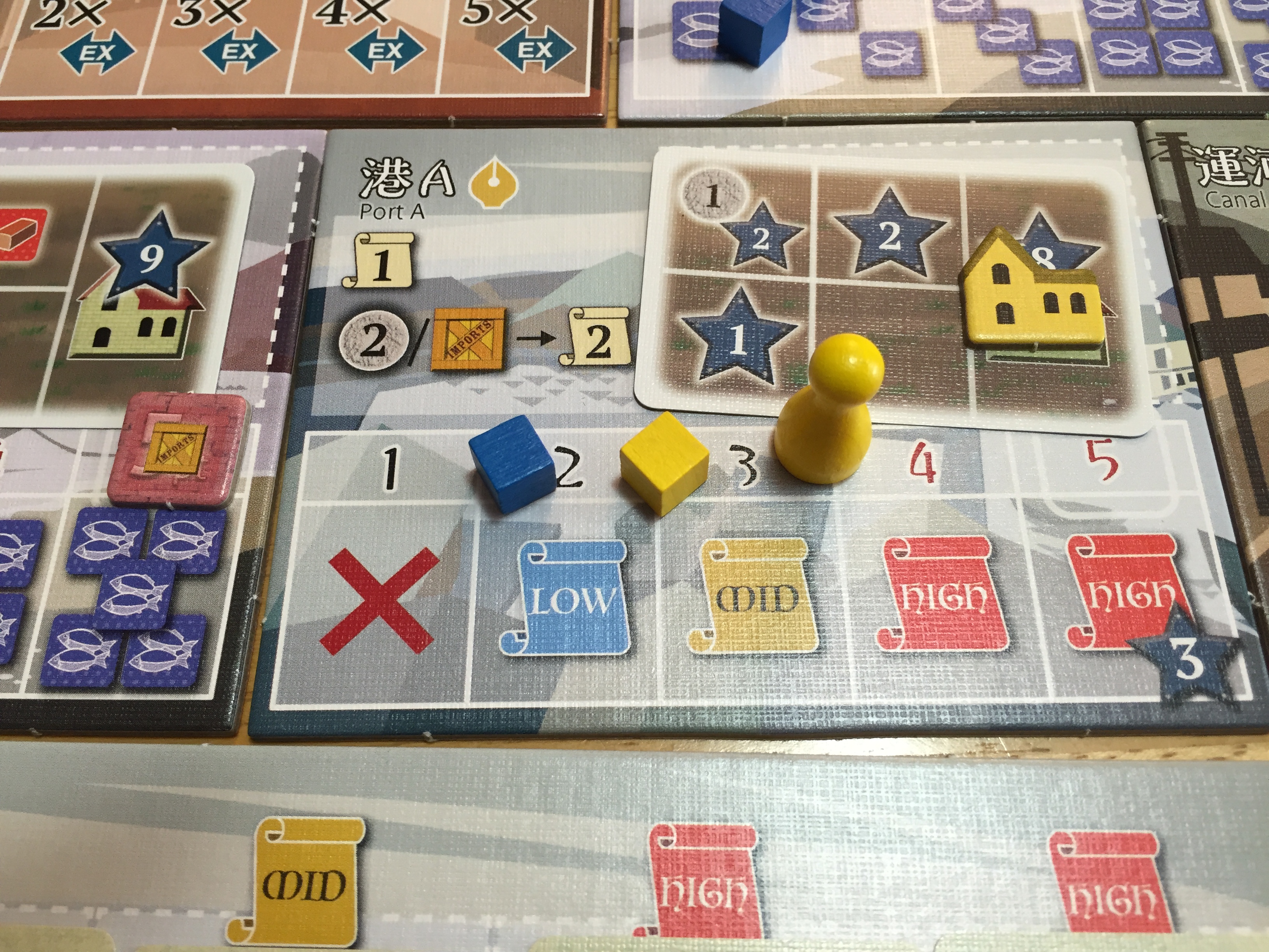 I’ve played 4 times already with 2 and 3 players. It plays quite well with both numbers. The game does go to 4 but I think I will wait to play with 4 experienced players. There are a myriad of options to consider in this game and that could potentially slow the game a bit too much for me with too many new players. (YMMV on this point but I prefer snappy play) That said, mostly what I enjoy are the options in this game. You can go for points in many directions. Point salad some might say, but the big plus for me is that Yokohama feels so cohesive with these options. It does not feel disjointed at all. I have seen some very different strategies and the game has been close. I also like having to balance actions for points with actions for moving assistants and buildings from your warehouse to your hand. The mechanisms are not new but the way the game meshes keeps the mechanisms fresh. Is there interaction? Yes, it tends to be a little indirect but a well-placed president can certainly change someone’s plans. Of course there is a race aspect to meeting achievements or finding a place on the church or customs board. With the multiple game ending conditions you may be able to control it to your advantage and it’s important to watch your opponents closely. So far Yokohama is my favorite game this year.