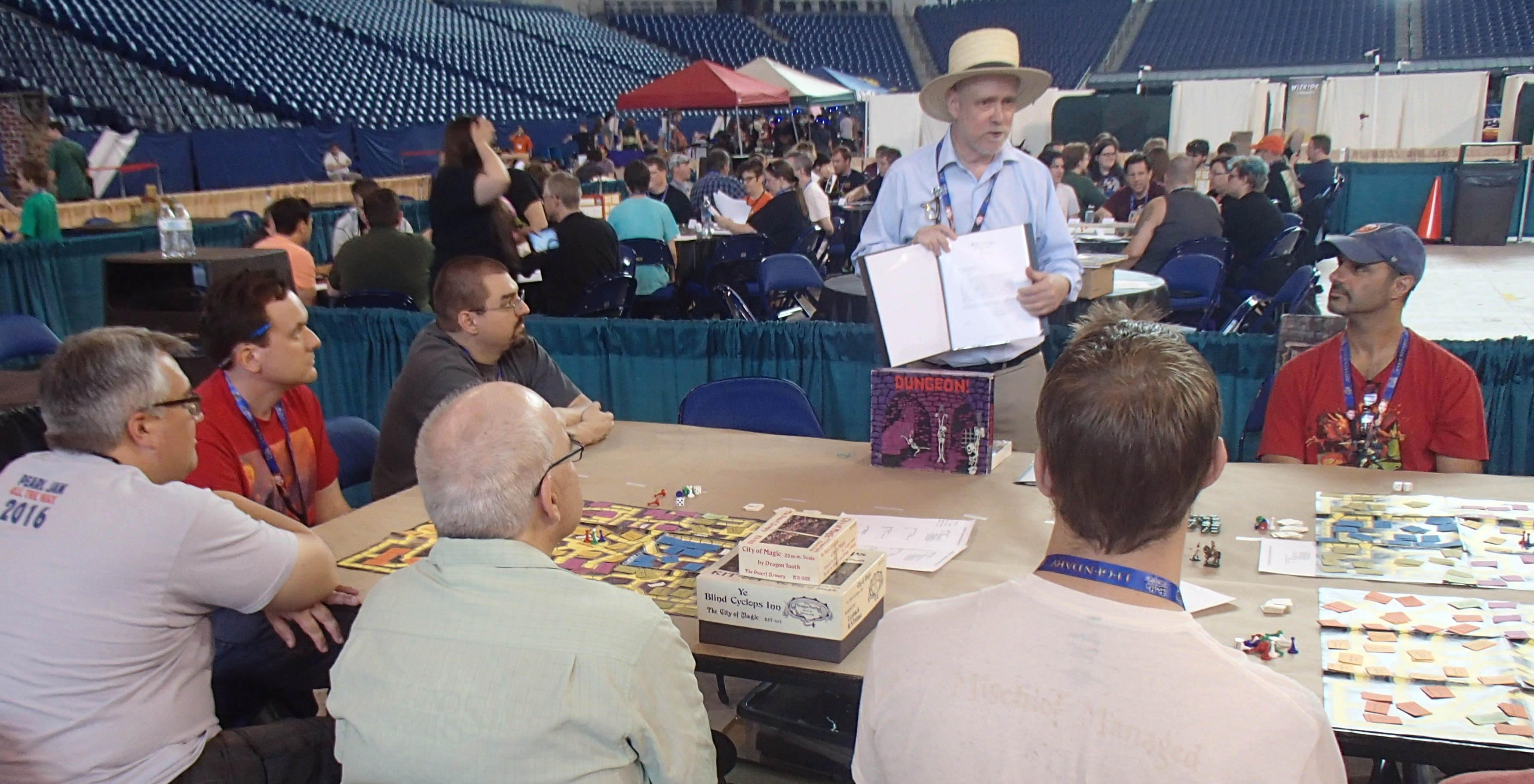 A group about to play the very first edition of Dungeon, the boardgame. I have an ancient copy at home but it isn’t quite that old..