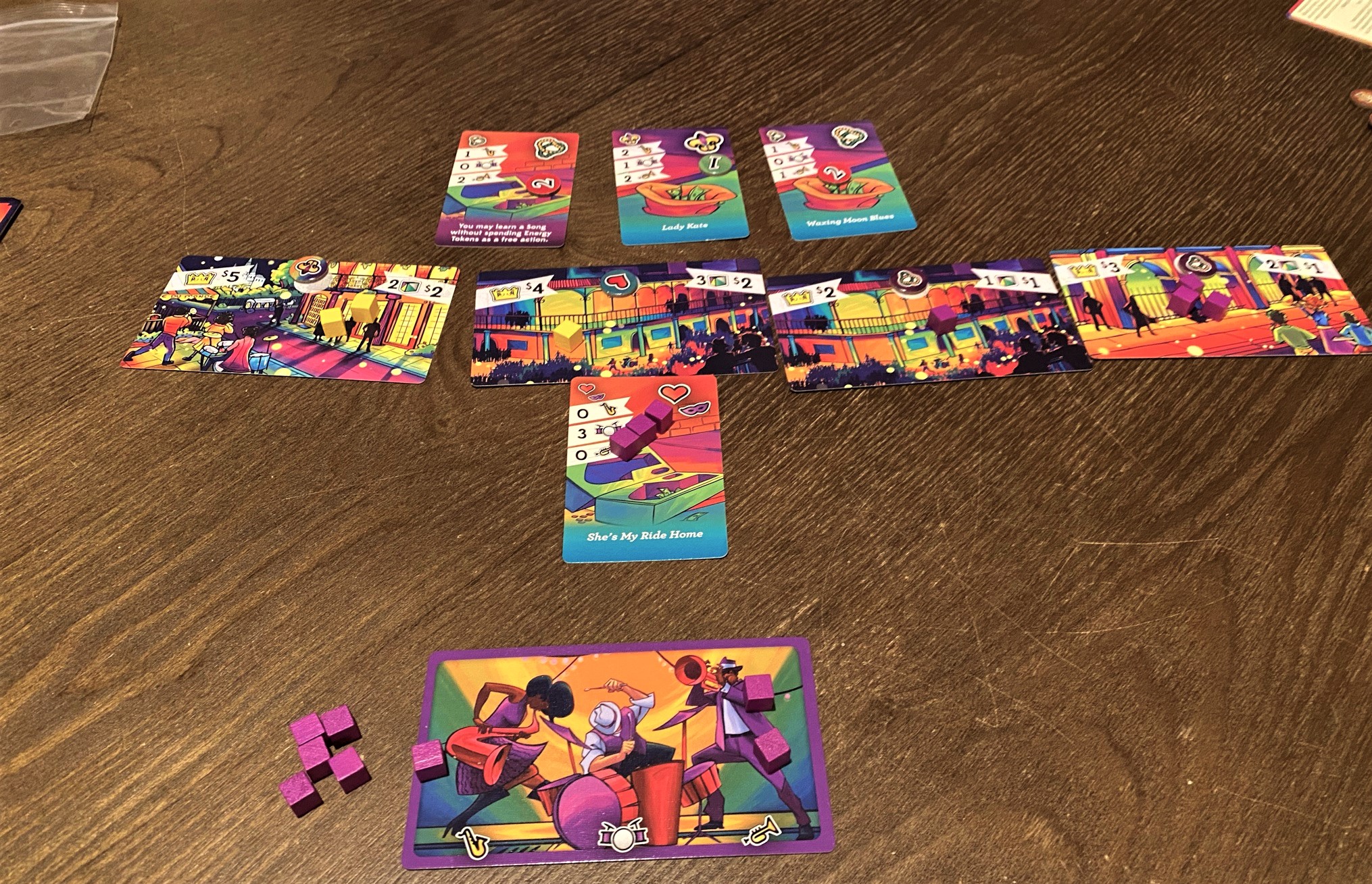 Up next was Big Easy Busking, a game I picked up solely based on its theme of music in New Orleans. One of the many things I love about New Orleans is the number of musicians busking all around the city; no matter where you are you can hear music. I had low expectations for this one after reading the rules, but it turns out to be pretty fun. It’s a light resource management/area control game with cards that deserves a more detailed review at some point.