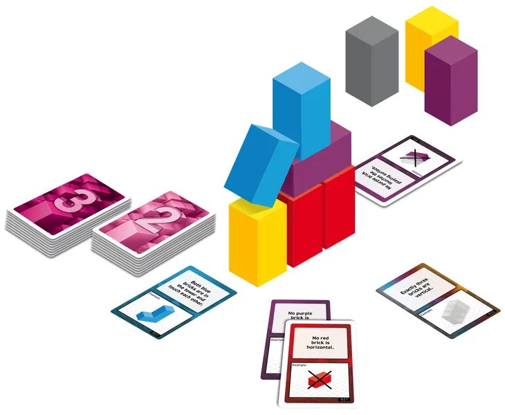 Once everyone has been given their cards, the players cooperatively try to build a tower of bricks – in a way that all of the rules on the player cards are respected. The catch – the players may not verbally communicate during the play. There is no order to the building phase, anyone can build or break down the tower in order to get the blocks in an arrangement that works for them.